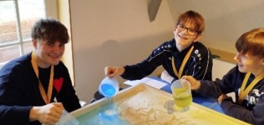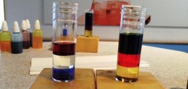 Als nächster Workshop folgte ein eher chemisches Experiment. Die Gruppe wurde in Zweiergruppen aufgeteilt und erhielt zwei Aufgaben. Die erste bestand darin, die deutsche Flagge mit verschiedenen flüssigen Stoffen zu konstruieren. Wichtig war hierbei die Dichte der Stoffe, welche bestimmt, ob ein Stoff auf dem anderen schwimmt. So konnten wir durch den Einsatz von Lebensmittelfarbe und genaues Abschätzen die Flaggen von Deutschland und den Niederlanden darstellen. Obwohl die Aufgabe relativ einfach war, machte sie trotzdem Spaß und stellte eine willkommene Abwechslung dar.