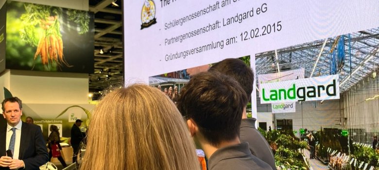 Am nächsten Morgen fuhren wir zum Messegelände. Dort wurden wir von Frau Düker im Namen des Genoverbandes herzlich empfangen. Anschließend gingen wir zum Messestand des Deutschen Raiffeisenverbands e.V., der mehr als 1600 große und kleine Nahrungsmittel- und Agrargenossenschaften, darunter auch bekannte wie die Raiffeisen-Märkte, Arla und Hochwald, vertritt. Dort sollten wir unsere Präsentation vor den Vorstandsmitgliedern der Regionalverbände halten. Zunächst richtete Frau Düker einige Worte an die Besucher, danach stellten wir unsere Schülergenossenschaft vor und erklärten unsere Funktionen und Aufgaben bei den Honeybees. Nachdem wir ein paar interessierte Rückfragen beantwortet hatten, wurden wir selbst noch über die Grüne Woche geführt und durften anschließend noch alleine umherschauen.