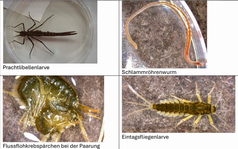 Als weiterer wichtiger Kennwert der Gewässergüte dienen darüber hinaus Kleintiere, die sich am Gewässergrund aufhalten. Ausgestattet mit Gummistiefeln und Keschern untersuchte die Gruppe daher auch den Bodenschlamm der Niers. Die anfänglichen Berührungsängste gegenüber den zutage geförderten unbekannten Kreaturen wichen schnell einem wachsenden Forschereifer. Schließlich konnte eine stattliche Zahl verschiedener Tierarten mithilfe von Binokularen und Bestimmungsschlüsseln identifiziert werden. Von den Schülerinnen und Schülern erstellte Kurzporträts der Tiere flossen zusammen mit Live-Bildern in einen Film ein, der der Lerngruppe anschließend digital zur Verfügung gestellt wurde. Hier einige „Stars“ des Films: